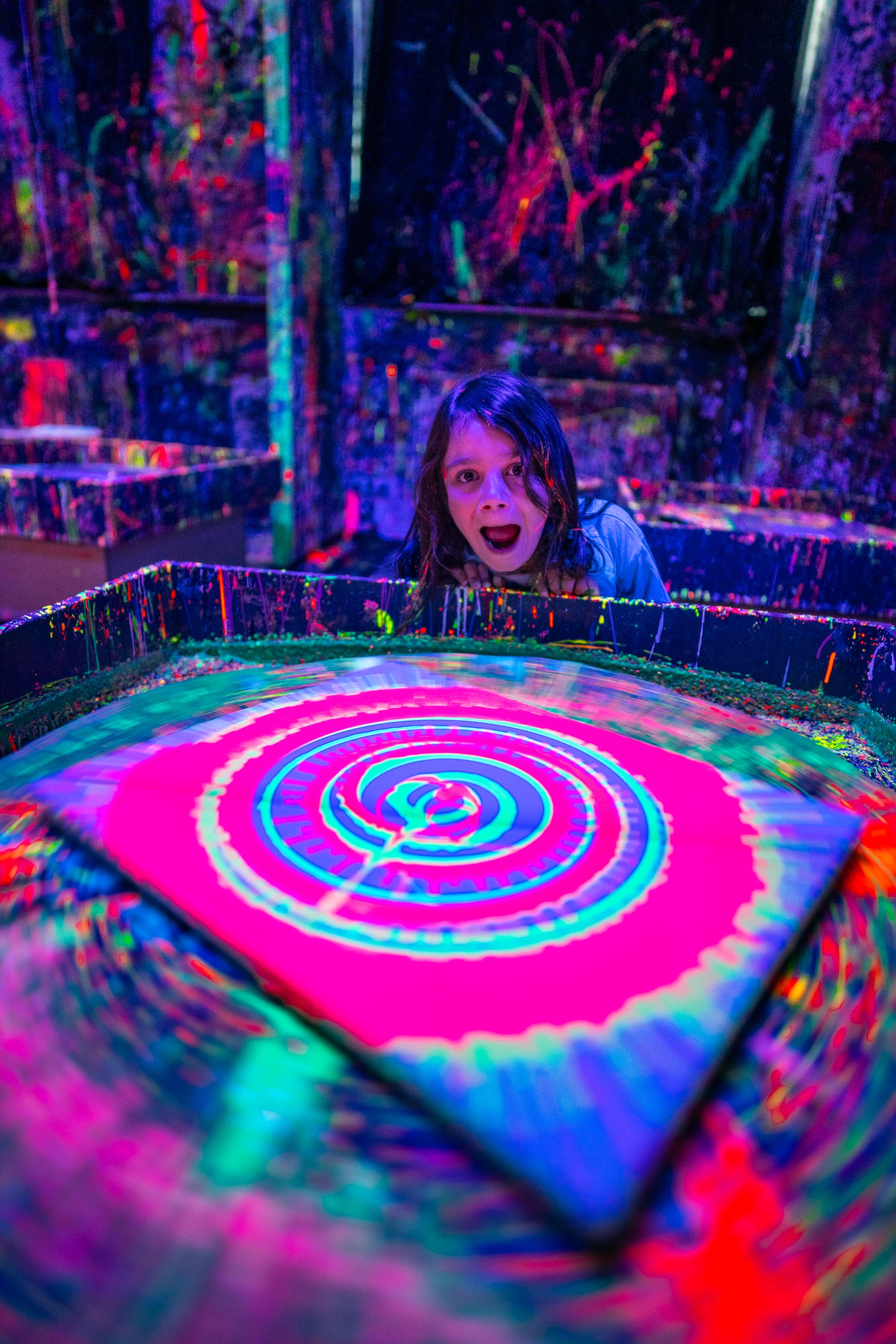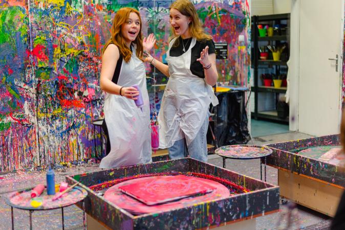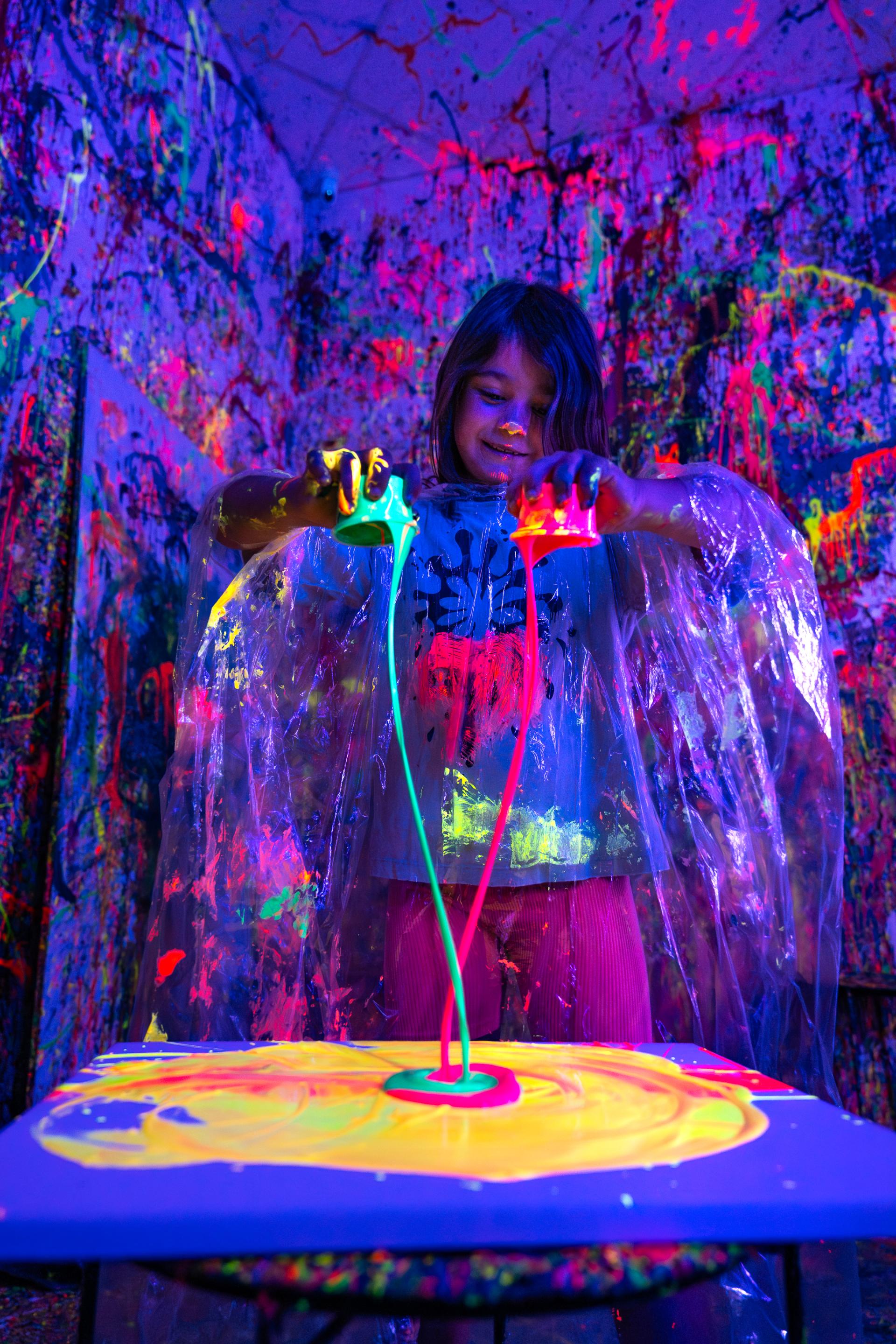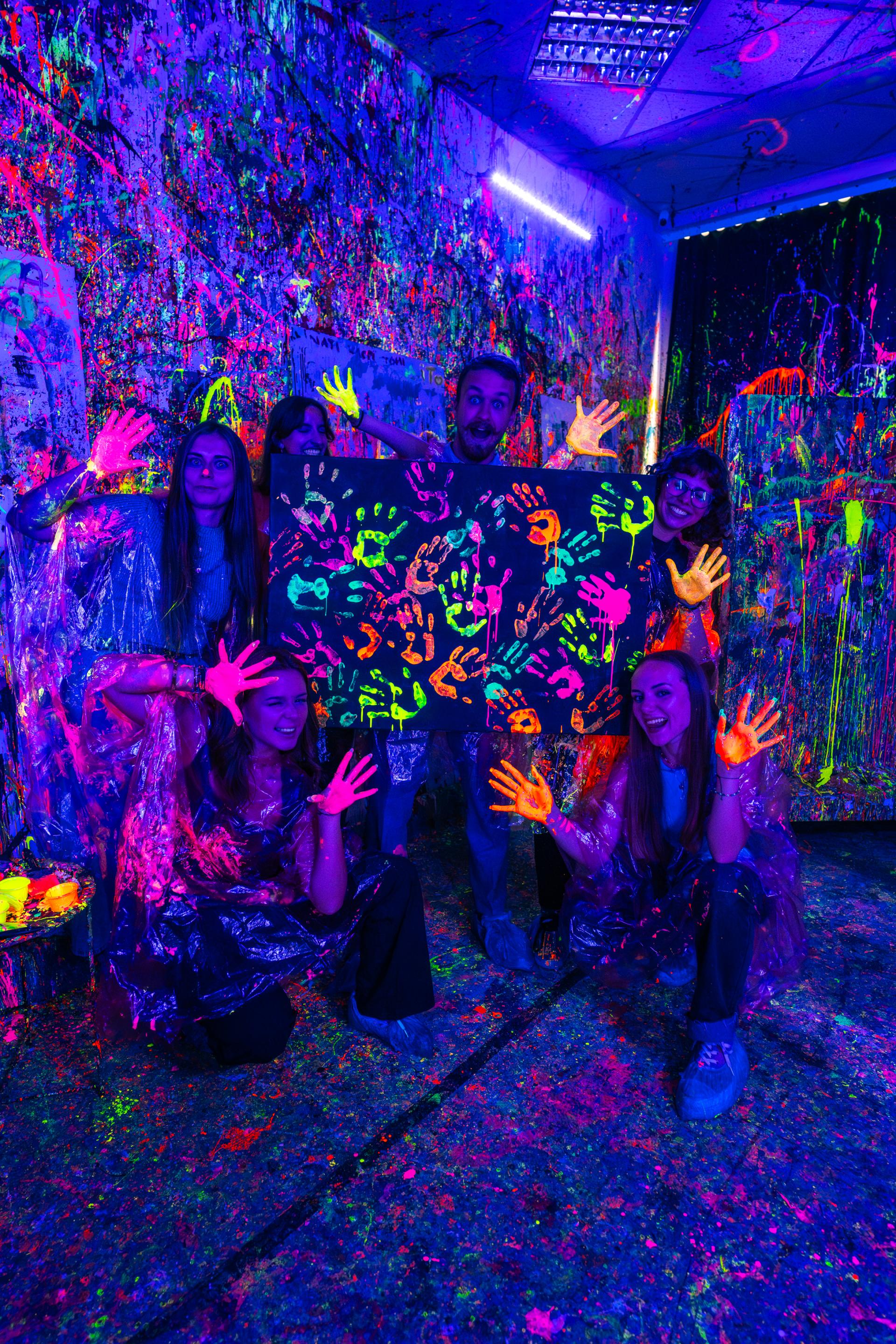 Oferujemy różnorodne sesje malowania w technice action painting. Możesz wybrać chlapanie, ręczne stoły obrotowe lub elektryczne stoły obrotowe z wahadłami. Jeśli chcesz zaszaleć, polecamy sesje malowania FLUO farbami fluorescencyjnymi, które zapewnią Ci niesamowite wrażenia wizualne.