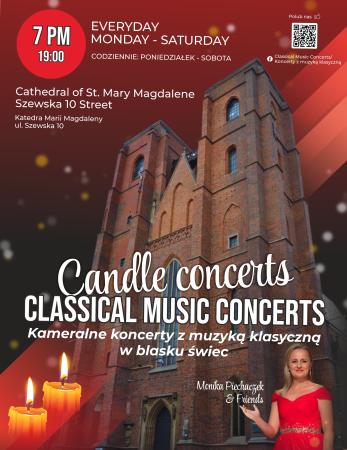 Koncerty Kameralne w Blasku Świec to niepowtarzalna okazja, by zanurzyć się w magicznym świecie muzyki na żywo. Wszystkie koncerty prowadzone są w kilku językach. Wyjątkowa akustyka, bliski kontakt z artystami oraz wysoki poziom artystyczny gwarantują niezapomniany wieczór we Wrocławiu, który na długo pozostanie w pamięci.