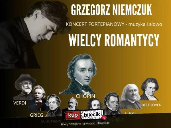 Epoka Romantyzmu była w muzyce reprezentowana przez bardzo wiele wybitnych osobowości. W programie "Wielcy Romantycy" pianista Grzegorz Niemczuk wybrał aż dziewięciu kompozytorów, układając niezwykle zróżnicowany i bogaty program. Publiczność będzie miała okazję usłyszeć wiele bardzo znanych utworów fortepianowych takich jak "Marzenie" Roberta Schumanna, "Dla Elizy" Ludwiga van Beethovena, Walca Johannesa Brahmsa, Suitę Peer Gynt Edwarda Griega czy słynną, wirtuozowską Rapsodię Węgierską nr 2 Franciszka Liszta. Dodatkowo zabrzmią równie piękne i fascynujące utwory Schuberta, Mendelssohna, Chopina oraz Verdiego (w transkrypcji F. Liszta). Ten koncert to prawdziwy kalejdoskop muzyki XIX wieku. Pełen różnorodnych emocji i nastrojów. Grzegorz Niemczuk jak zawsze sam poprowadzi koncert, opowiadając o wykonywanych utworach i kompozytorach, tworząc muzyczno-słowną narrację, która wciąga publiczność do świata muzyki.